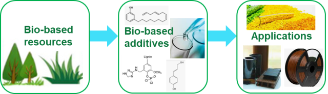 This project aims to synthesize new, safe, and sustainable polymer additives derived from renewable resources. Depending on the chosen biobased precursor, various chemical modification strategies will be designed and developed. The resulting bio-additives will then be incorporated into (bio)polymers through thermal extrusion to assess their performance.