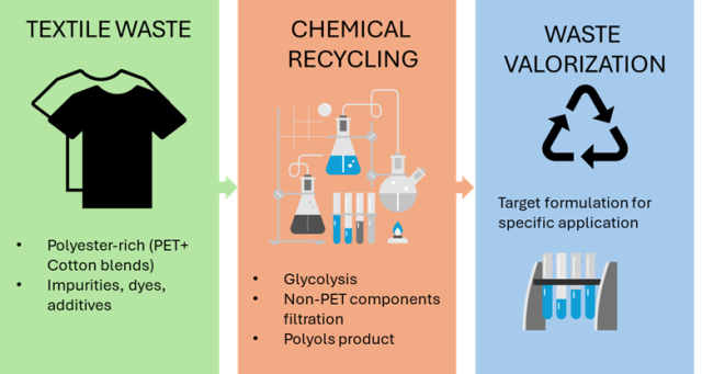 The rapid expansion of textile production and consumption generates growing amounts of polyester-rich waste, primarily composed of polyethylene terephthalate (PET) in pure or blended forms. Converting these residues into value-added products through chemical recycling represents a key step toward circular material flows. Among the most promising products are polyester-based polyols, which can serve as versatile intermediates for various applications.